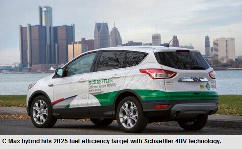 Schaeffler is testing the capabilities of 48V hybridization in concept vehicles including a Ford C-Max midsize SUV already compliant with the government’s 54.5 mpg (4.6 L/100 km) 2025 fuel-efficiency requirement.